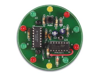 "10 LED:s lyckohjul. Ett knapptryck startar ""hjulet"". Hjulet snurrar med avtagande hastighet. När hjulet stannar lyser en lysdiod med fast sken. Automatisk avstängning. Låg strömförbrukning- strömförsörjning: 9V batteri ( medföljer ej) - dimension: runt 64x33mm"
